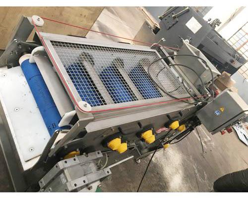 带式压榨机工作时,上下两条环状滤带在各自的气缸作用下张紧,并在传动辊的带动下,按各自的回路运动,待压榨的物料通过可调节布料箱,摊铺在下滤